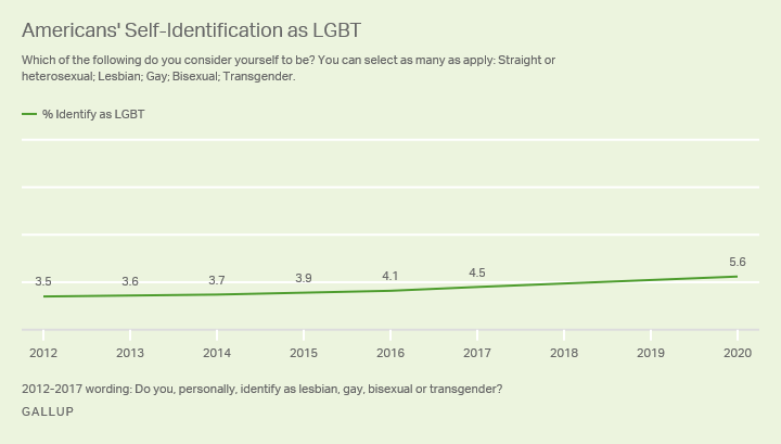 Gallup’s latest LGBTQ+ identification poll from February shows that today, 5.6% of Americans identify as LGBTQ+ from 4.5% in 2017. Nearly a decade ago, it was just 3.6%.