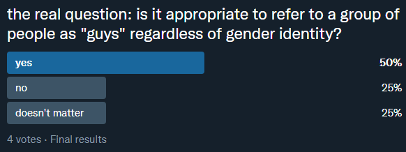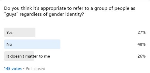 Some thought this discussion had already been put to bed. Others are still making cases for either side. Should we as a greater society be using the term “guys” to refer to a group of people regardless of gender identity?